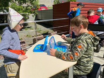Разгадав все загадки и собрав подсказки на страницах книг, юные пираты нашли настоящий клад: книгу с картой. Ребята оставили восторженные отзывы и озвучили желание посещать мероприятия, как можно чаще. Покидать библиотеку никто не спешил. На крыльце библиотеки была организована литературно-развлекательная площадка «Старт в лето!» сотрудниками Библиотеки№21. Пиратские приключения продолжались. Книжный просмотр «Время читать про пиратов» предлагал самые интересные книги о пиратах и приключениях: Р.Стивенсон «Остров сокровищ», Ж.Верн «Пятнадцатилетний капитан» и даже «Доктор Айболит» К.Чуковского, тоже ведь о пиратах. На площадке всех посетивших встречали «пираты» -библиотекари, которые приготовили много конкурсов, викторин на знание героев книг о пиратах, проверяли знания в географии и морском деле. Ну и, конечно, какие пираты и приключения без морского боя? С удовольствием сражались в игру «морской бой» прямо на солнышке под открытом небом. Веселый «пират», размахивая флагом с изображением «веселого Роджера», зазывал всех детей микрорайона на площадку около библиотеки. Все это время звучали самые лучшие и популярные детские песни, создавая праздничное настроение и детям, и взрослым.