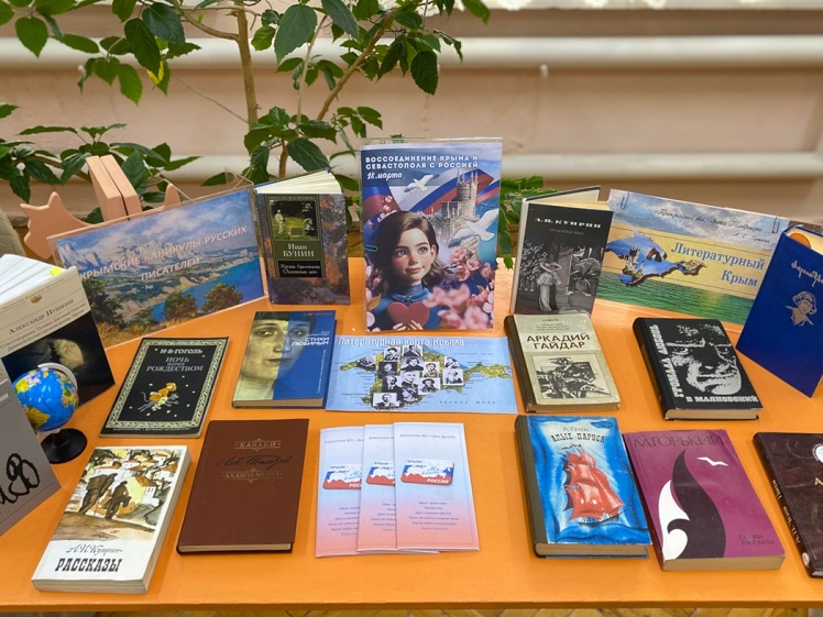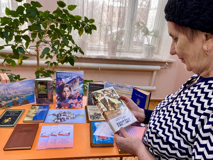 В мероприятия были представлены интересные факты об истории Крыма, его географических и климатических достопримечательностях. Говорили об историческом и культурном единстве республики Крым, города Севастополя с Российской Федерацией. Особое внимание уделено страницам истории героической обороны Севастополя в годы Великой Отечественной войны. Впечатлил всех присутствующих видеоролик «Крымский мост», в котором за три минуты показано строительство одного из самого протяженного моста в мире. А еще Крым – это источник вдохновения для творчества. Полуостров всегда был местом паломничества писателей, поэтов, художников, композиторов. Памятные места здесь связаны с именами А.С. Пушкина, Л.Н. Толстого, А.П. Чехова, И.А. Бунина, М. А. Волошина, А. С. Грина. Звучали поэтические строки А.Пушкина « Фонтану Бахчисарайского дворца», написанные в 1824 году, стихи М.Волошина, А.Ахматовой, М.Цветаевой. С интересом слушали рассказ о «Севастопольских рассказах» Л.Н.Толстого. История героической борьбы Севастополя с врагами дала писателю материал для его рассказов, а сам он произведен был в чин прапорщика и направлен служить в Крым. Книжный просмотр «Русские писатели, которых вдохновил Крым» представил участникам мероприятия Крым литературный. Лейтмотивом мероприятия стали строки стихотворения «Крым» Владимира Маяковского: