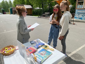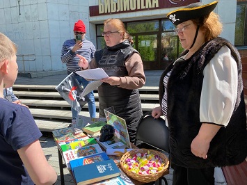 Разгадав все загадки и собрав подсказки на страницах книг, юные пираты нашли настоящий клад: книгу с картой. Ребята оставили восторженные отзывы и озвучили желание посещать мероприятия, как можно чаще. Покидать библиотеку никто не спешил. На крыльце библиотеки была организована литературно-развлекательная площадка «Старт в лето!» сотрудниками Библиотеки№21. Пиратские приключения продолжались. Книжный просмотр «Время читать про пиратов» предлагал самые интересные книги о пиратах и приключениях: Р.Стивенсон «Остров сокровищ», Ж.Верн «Пятнадцатилетний капитан» и даже «Доктор Айболит» К.Чуковского, тоже ведь о пиратах. На площадке всех посетивших встречали «пираты» -библиотекари, которые приготовили много конкурсов, викторин на знание героев книг о пиратах, проверяли знания в географии и морском деле. Ну и, конечно, какие пираты и приключения без морского боя? С удовольствием сражались в игру «морской бой» прямо на солнышке под открытом небом. Веселый «пират», размахивая флагом с изображением «веселого Роджера», зазывал всех детей микрорайона на площадку около библиотеки. Все это время звучали самые лучшие и популярные детские песни, создавая праздничное настроение и детям, и взрослым.