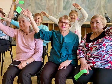 С группой «Здоровье», в которой занимаются люди серебряного возраста, библиотекари сделали бодрую зарядку под веселую музыку.